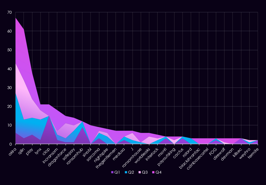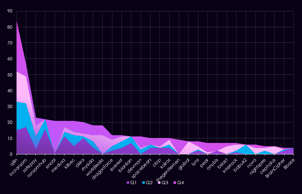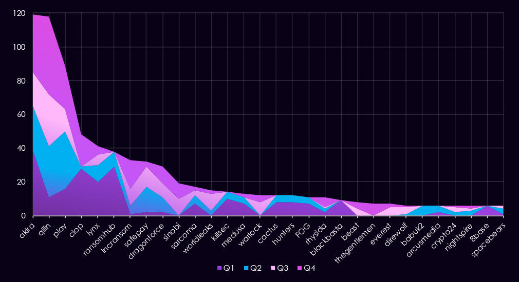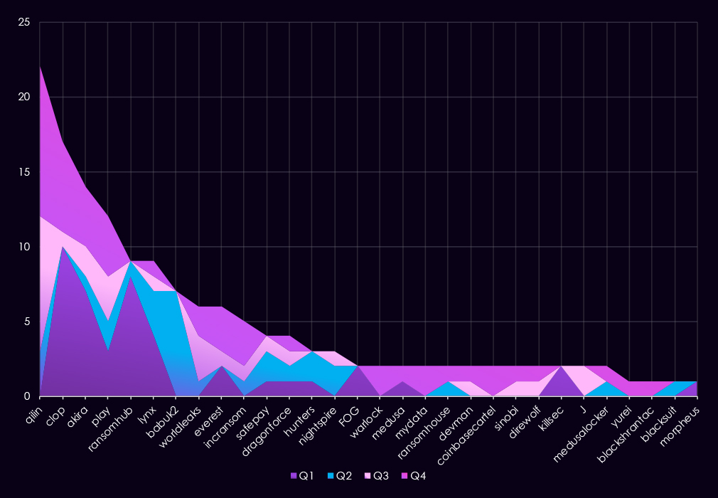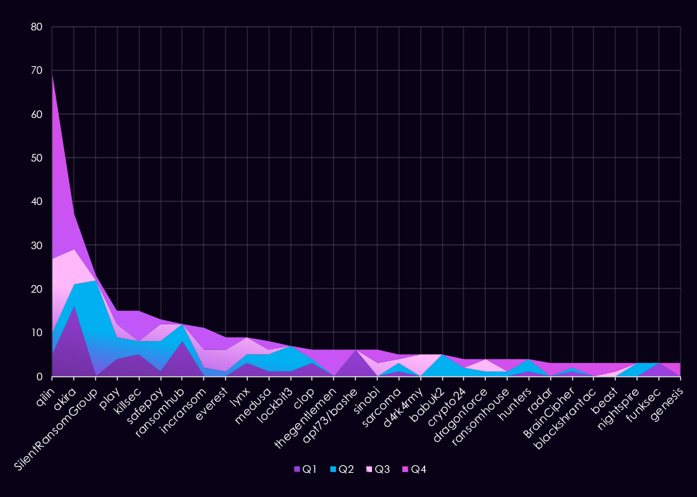 Overall, the data shows a shift from broadly distributed activity in the first half of the year to a more concentrated threat landscape by Q4, driven primarily by a single dominant ransomware actor.