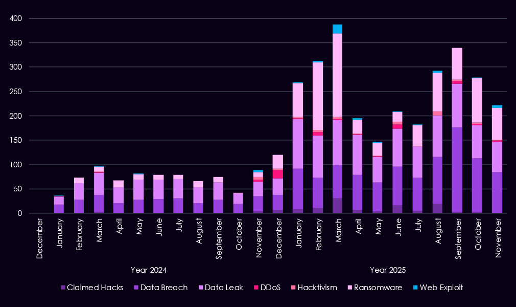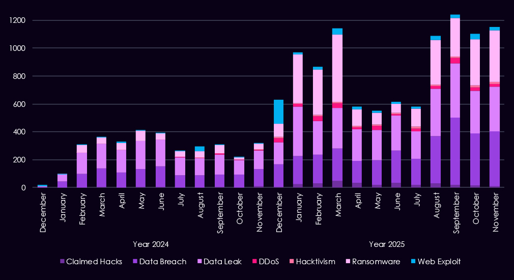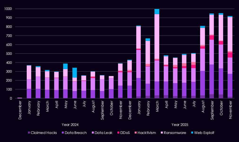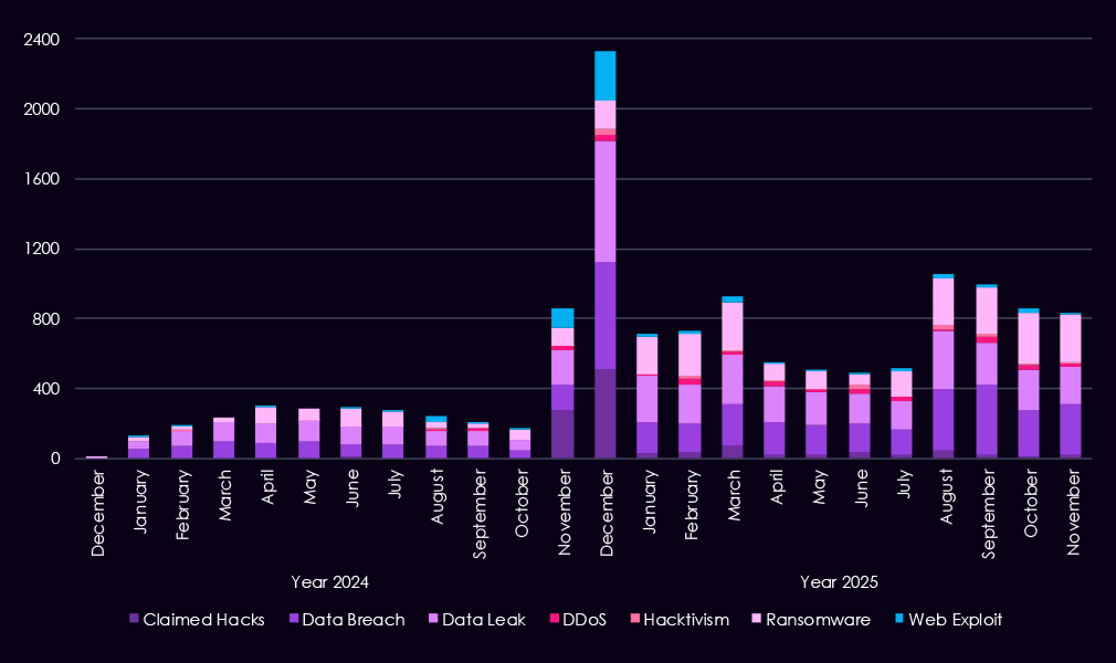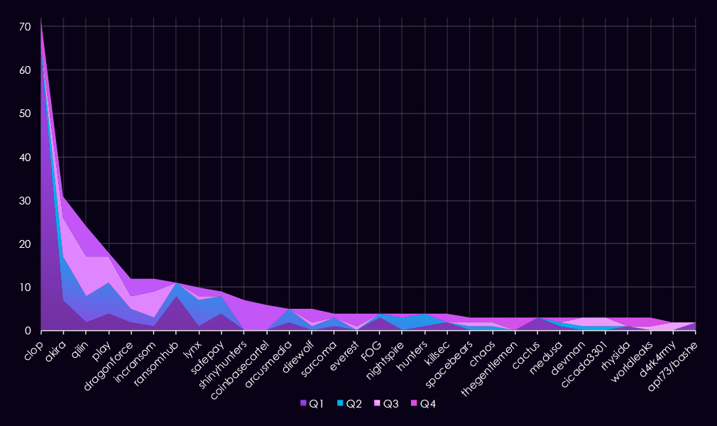 Overall, the data shows a shift from broadly distributed activity in the first half of the year to a more concentrated threat landscape by Q4, driven primarily by a single dominant ransomware actor.