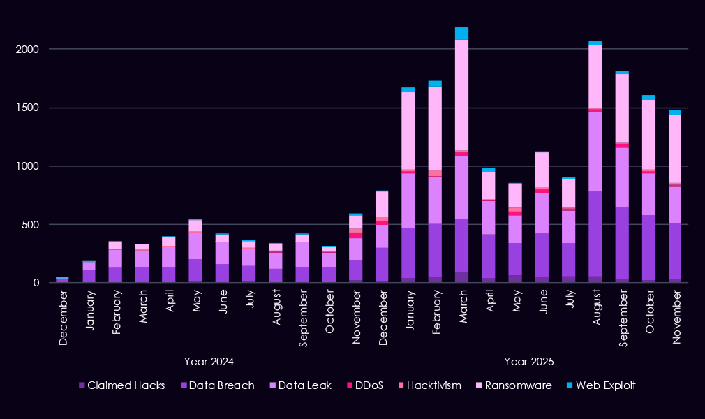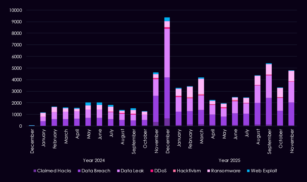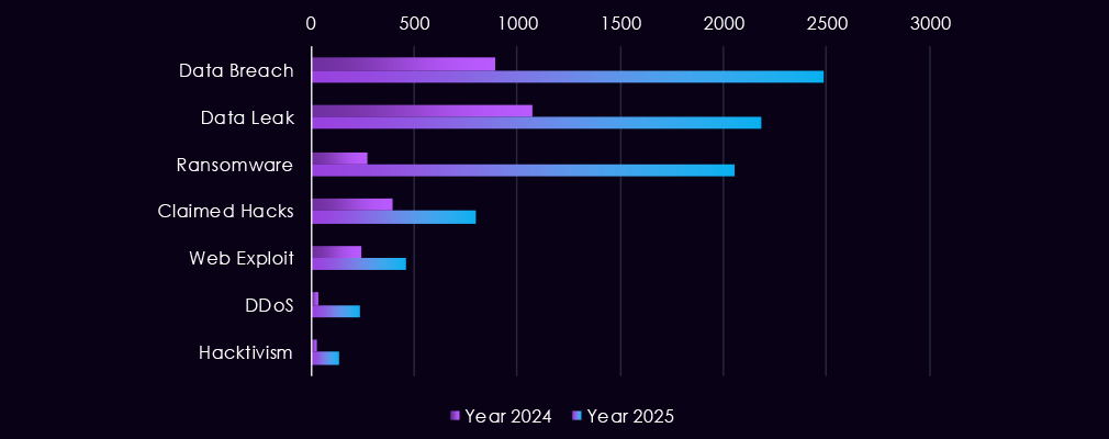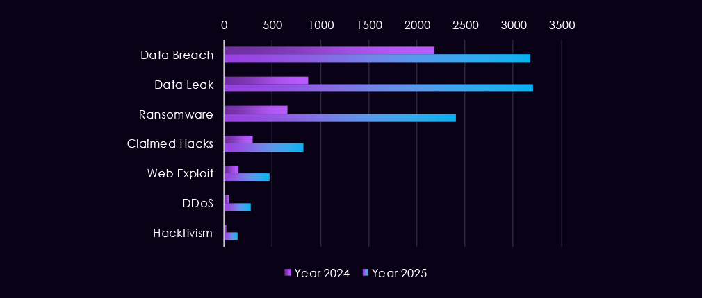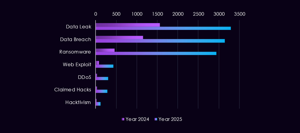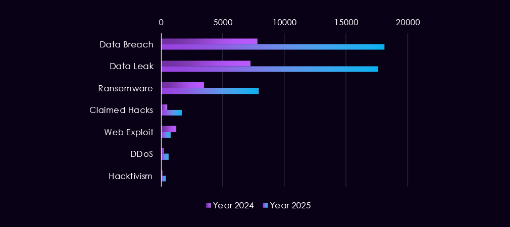 Overall, the 2025 pattern reflects a shift toward more frequent, higher-volume discussions of data exposure and ransomware, consistent with increasingly organized and monetization-driven activity targeted by even lower-skill threat actors driving most of the chatter.