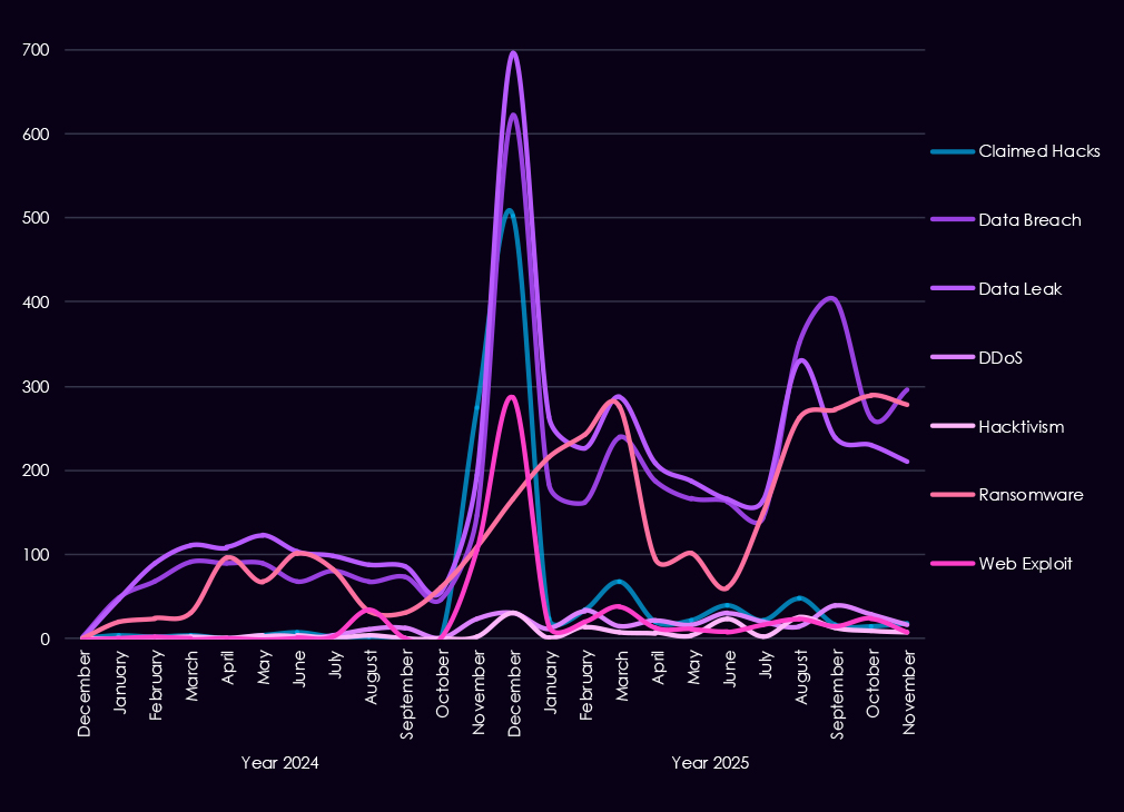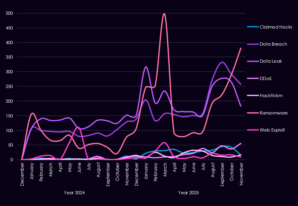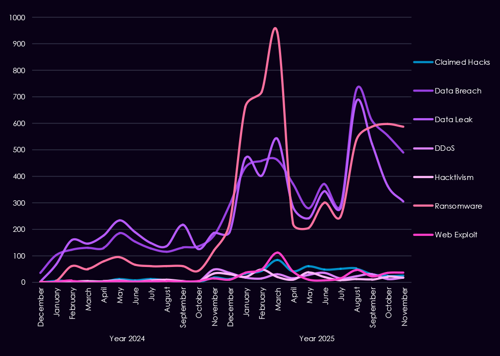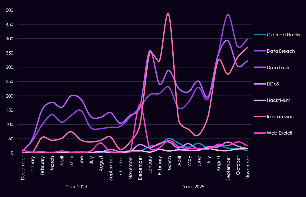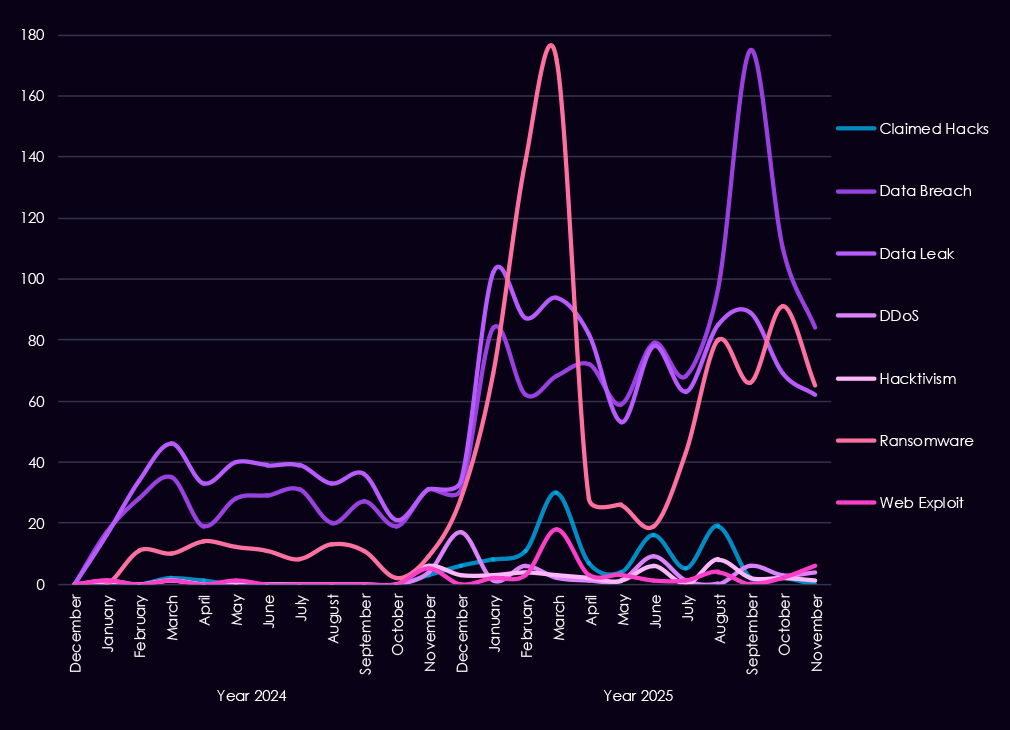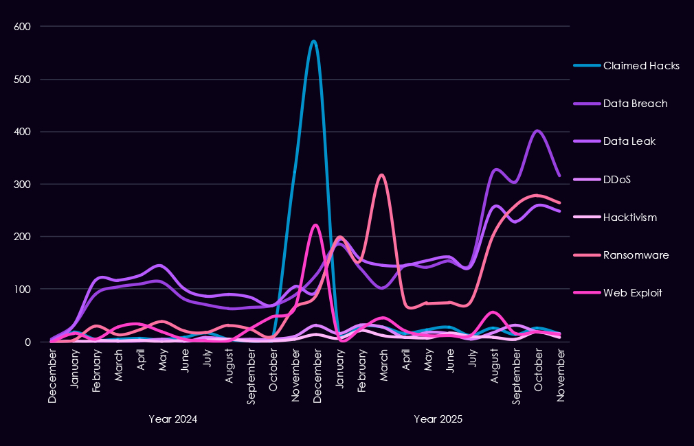 Underground and dark web chatter increased sharply from late 2024 into 2025, dominated by data breaches, data leaks, and ransomware-related discussions. Ransomware chatter showed repeated escalation across the year, consistent with sustained extortion pressure against manufacturers where downtime and supply chain disruption carry significant financial impact. Mentions of claimed hacks and web exploits also increased, while DDoS and hacktivism remained lower-volume and episodic.
