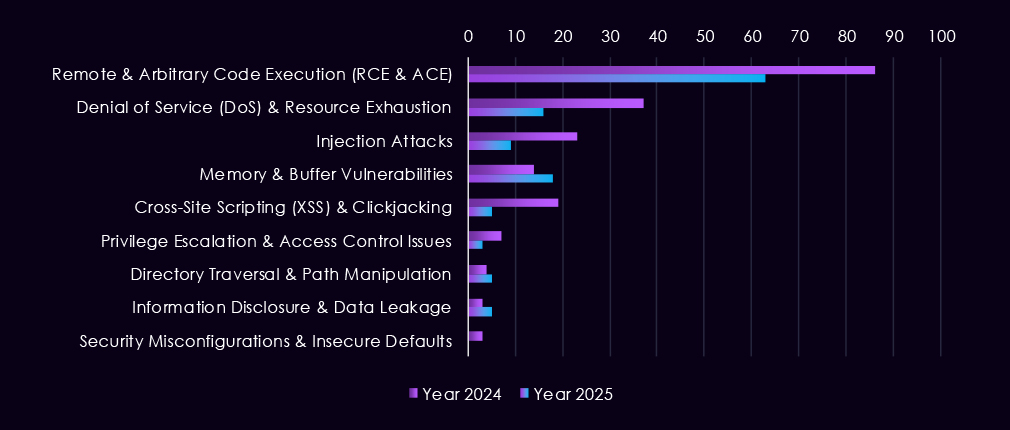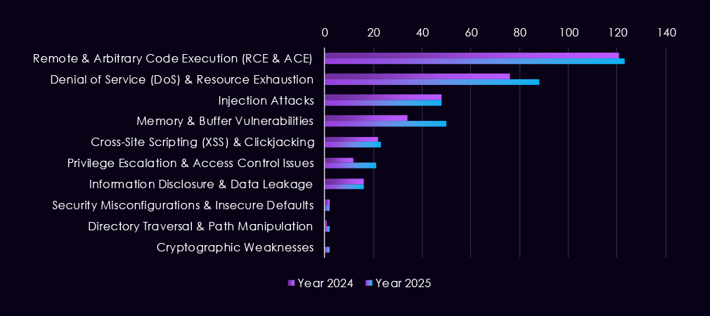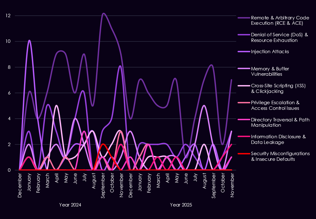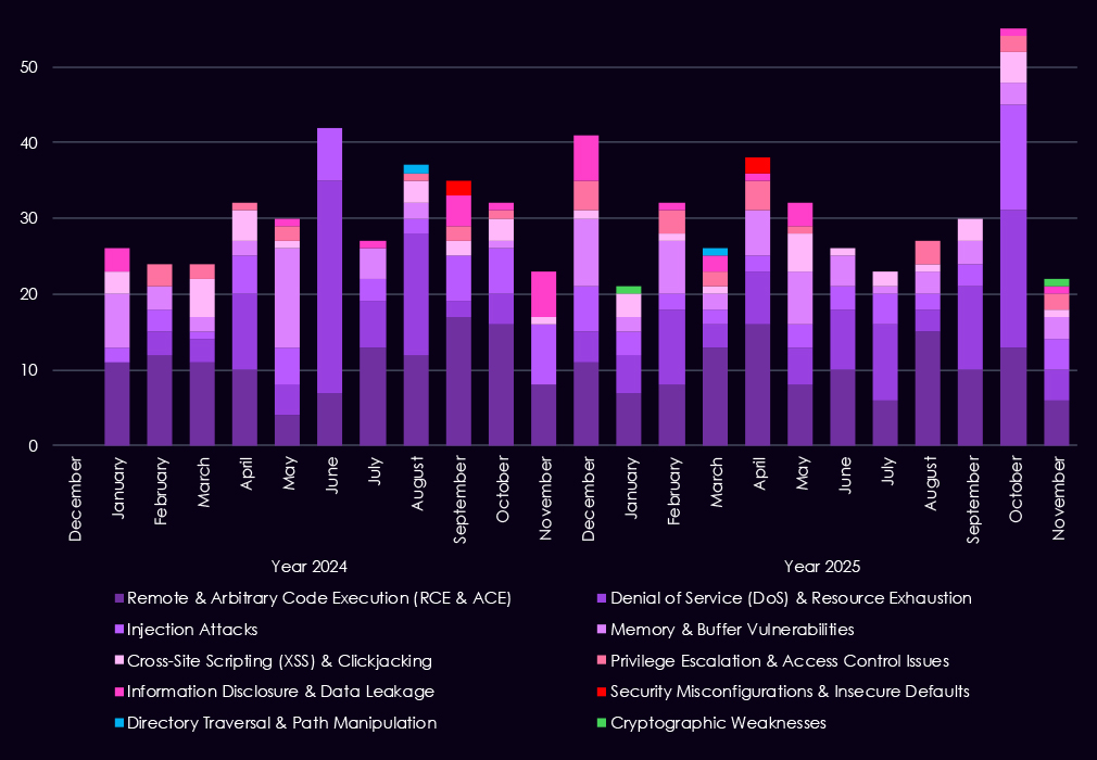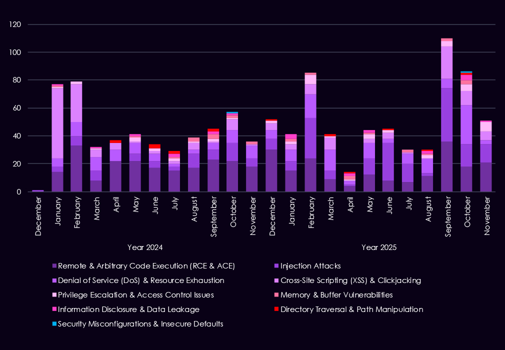 Reported CVEs affecting the manufacturing industry and technology show a strong and sustained concentration on high-impact vulnerability classes, with 2025 marking a clear increase in volume and consistency across most categories. Remote and arbitrary code execution (RCE/ACE) vulnerabilities dominate, appearing persistently throughout the year and accounting for the largest share of reported issues. This highlights the ongoing risk of direct system compromise across manufacturing IT and industrial-adjacent environments.