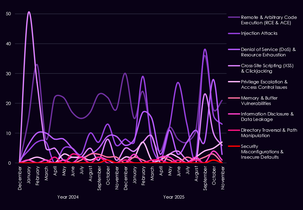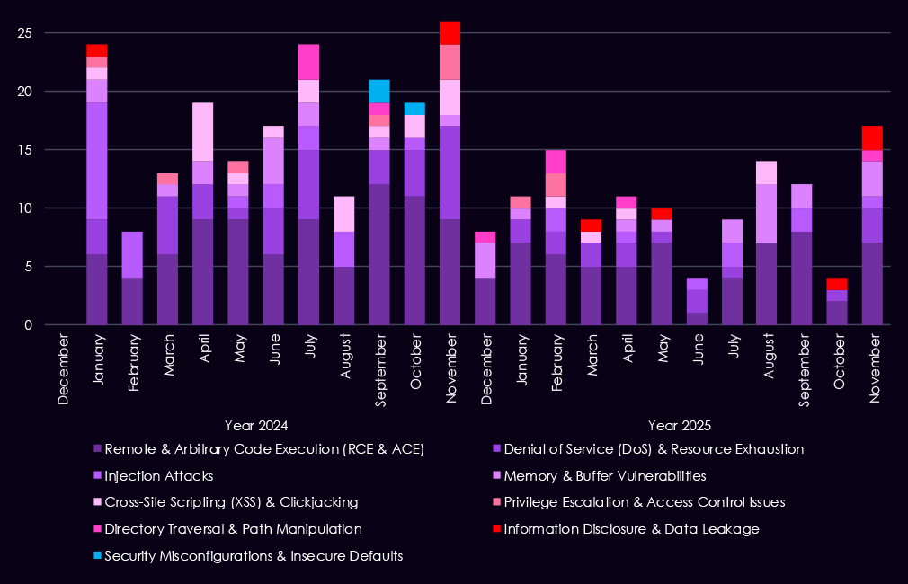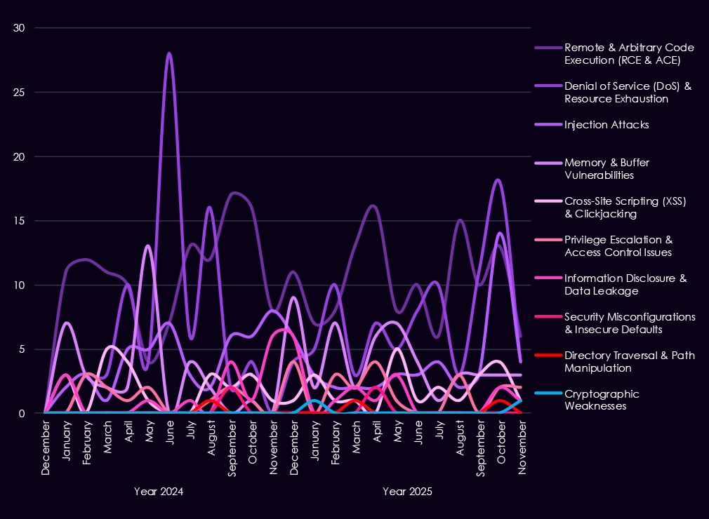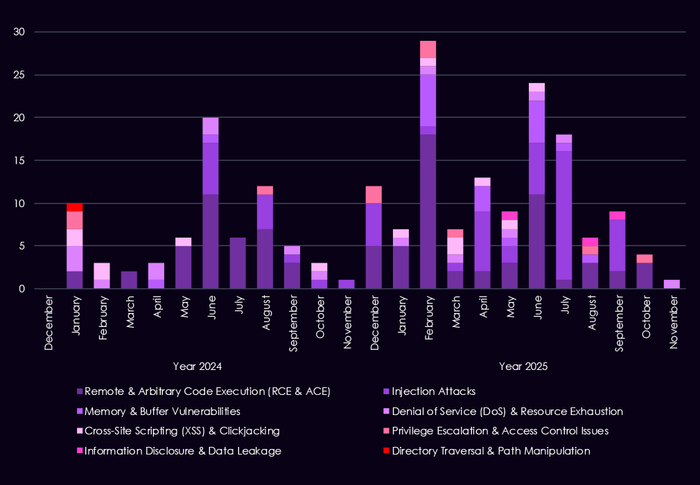 Denial-of-service and injection vulnerabilities appear intermittently, reflecting exposure of internet-facing services and the operational sensitivity of materials operations to availability issues. Memory and buffer vulnerabilities continue to surface at low but steady levels, suggesting attention to deeper technical flaws that can enable post-compromise or vulnerability chaining. Other categories – including XSS, privilege escalation, directory traversal, and information disclosure – remain present but comparatively limited in volume.