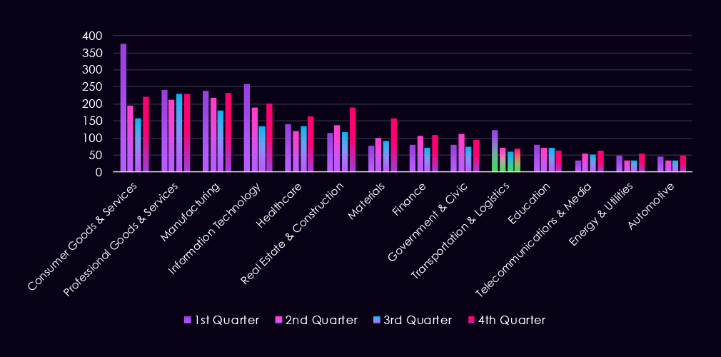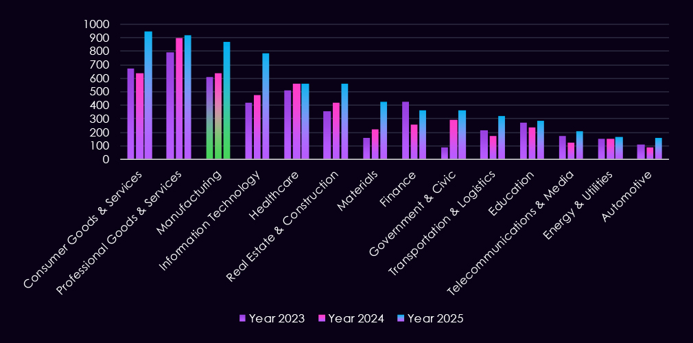 The bar chart above is focused only on 2025, and the victim counts per quarter are shown clearly and easily to see the trends. The manufacturing industry saw declining numbers from Q1 to Q3, followed by a jump to the Q1 level during Q4.