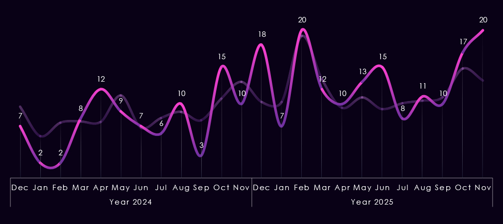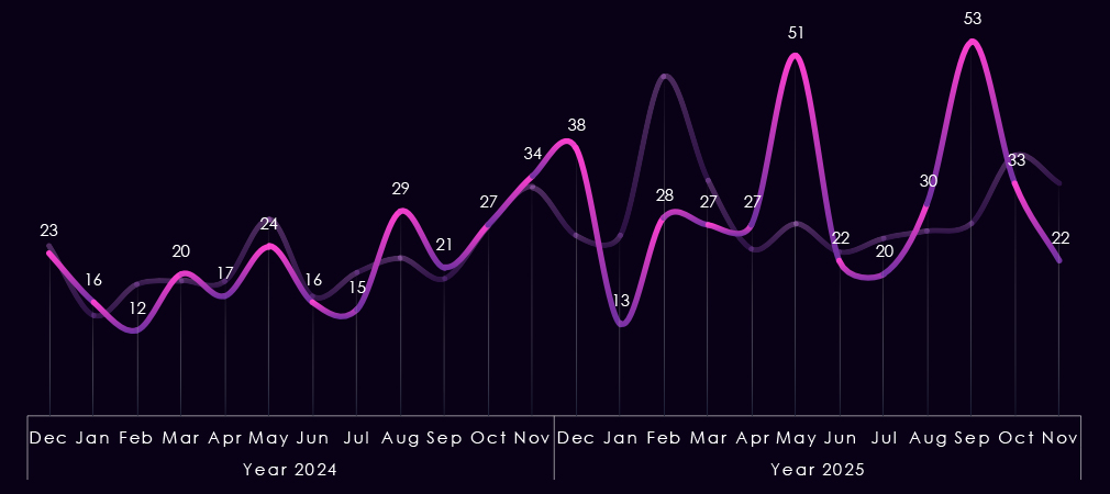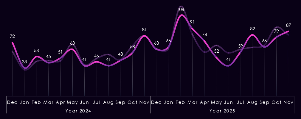 By Q4, activity intensified further. Qilin (46) recorded the highest quarterly volume of the year, while Akira (34) and Play (26) remained highly active. Several gangs, including IncRansom (17), DragonForce (10), and TheGentlemen (7), also increased late-year activity, adding to overall pressure on the sector.