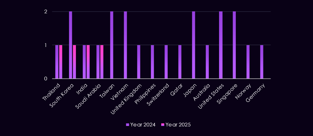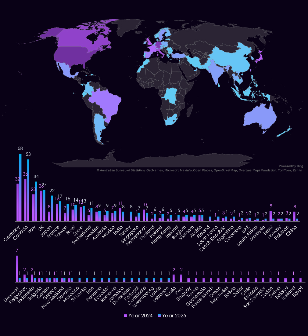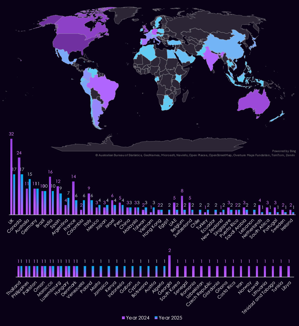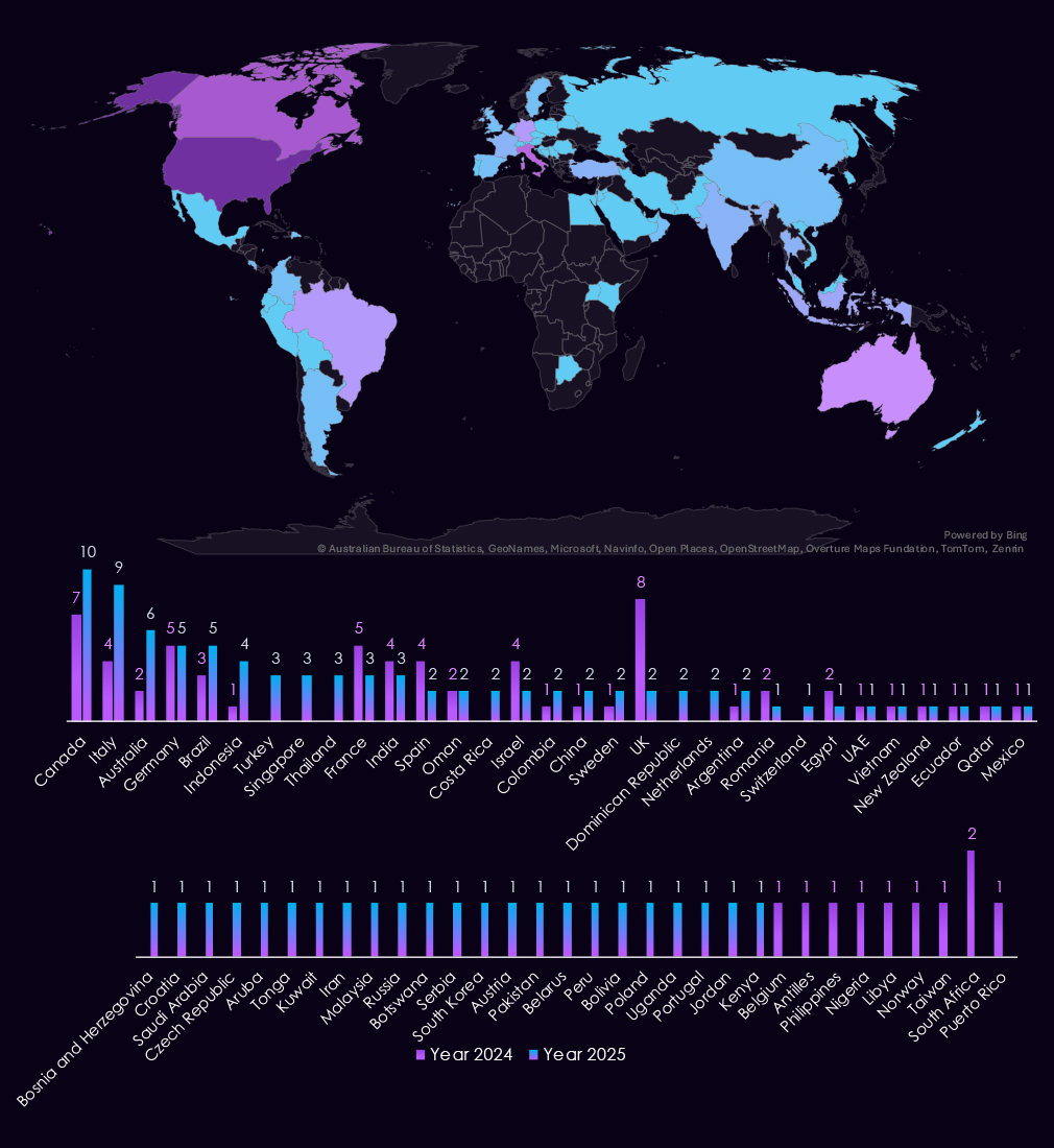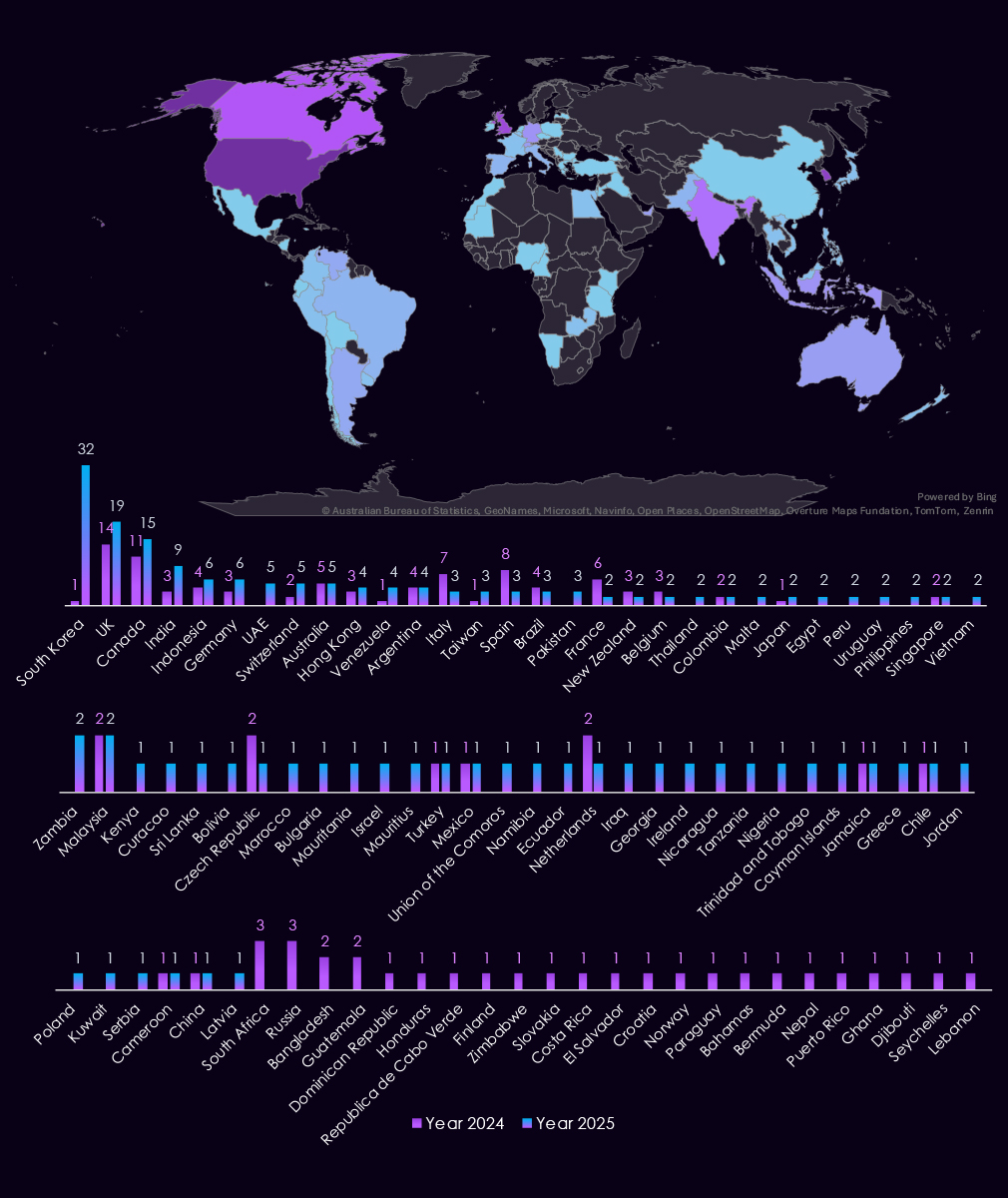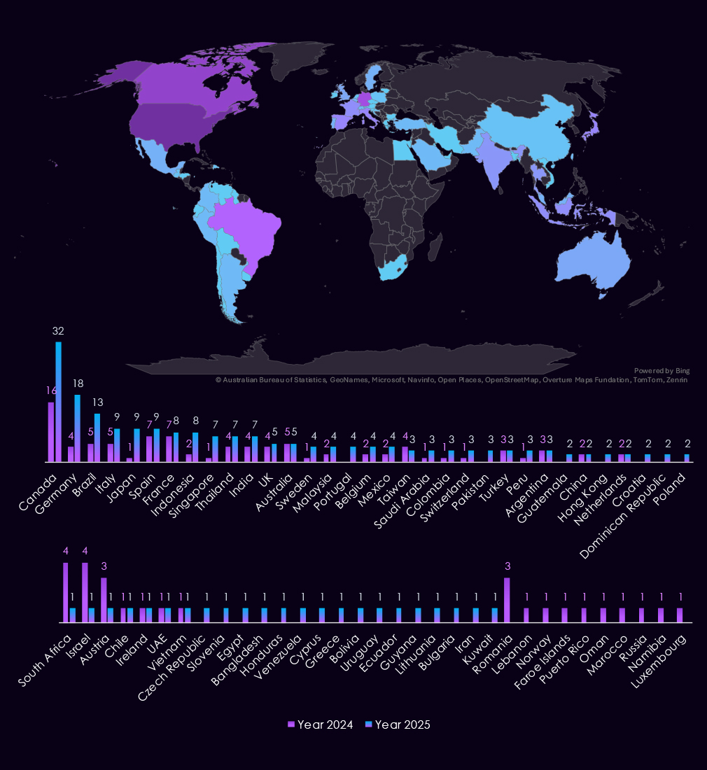 Compared to 2024, 2025 shows slightly broader dispersion across additional jurisdictions, including single-observation cases in Europe, Southeast Asia, and the Middle East (for example, Canada, UAE, Netherlands, Germany, and Indonesia).