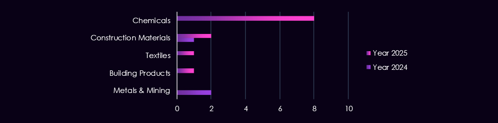 Observed victims are concentrated in countries with known strong mining, metals, chemicals, and upstream industrial supply chains. In 2025, the most targets include Japan, South Korea, the US, Australia, and India, alongside sustained activity in Taiwan and the UK. These locations host major extraction operations, advanced materials processing, and globally integrated suppliers.