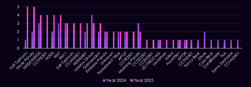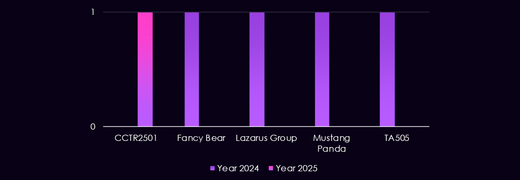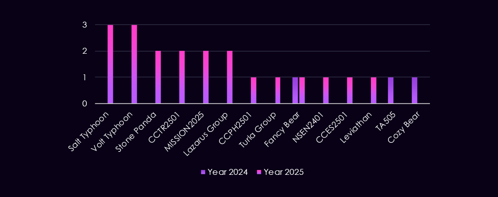 Financially motivated groups such as TA505 and FIN7 are also present, reflecting ongoing ransomware and access monetization risk. The growing presence of newly tracked CC- and NS-prefixed clusters (for example, CCVN2501, CCTH2501, CCES2501, NSEN2401) in 2025 highlights increasingly diverse threat actors.