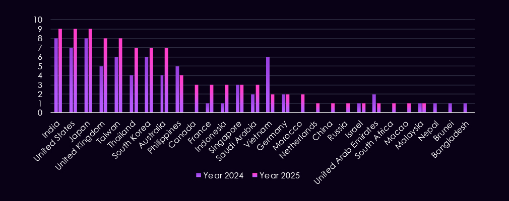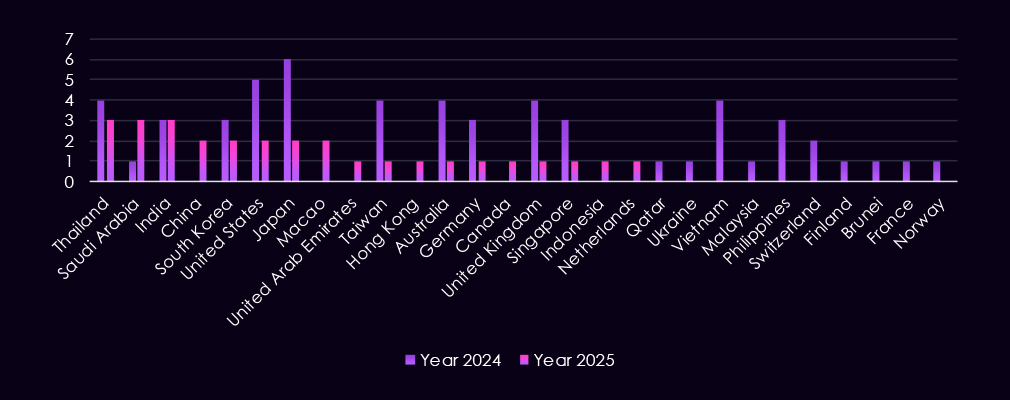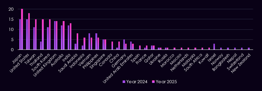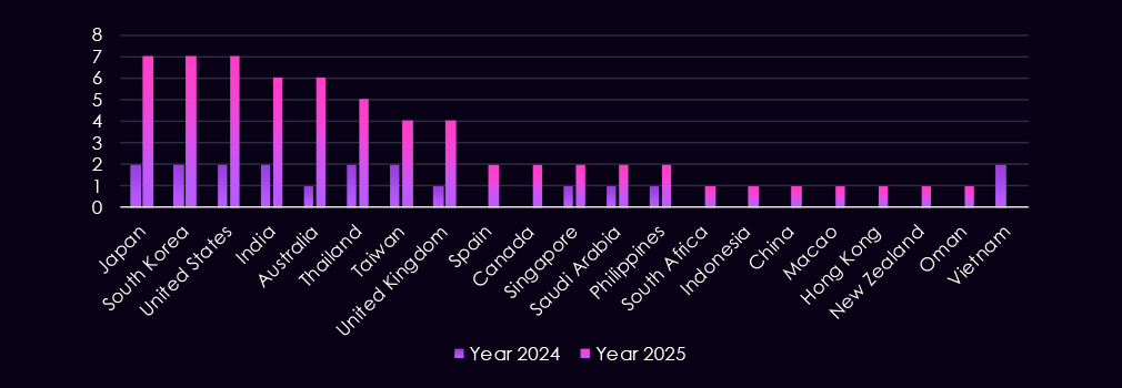 The geographic targeting is concentrated across Asia-Pacific, North America, Europe, and the Middle East. In 2025, the most frequently affected countries include Saudi Arabia, Thailand, and India, followed by repeated targeting of South Korea, the United States, Japan, China, and Macao.