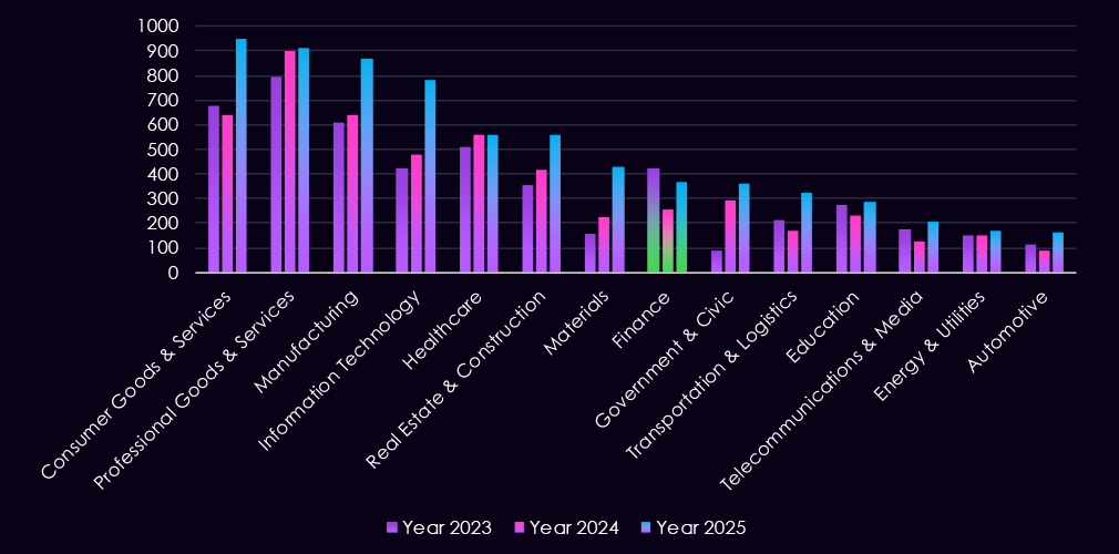 The bar chart above is focused only on 2025, and the victim counts per quarter are shown clearly and easily to see the trends. The finance industry recorded alternating activity between quarters.