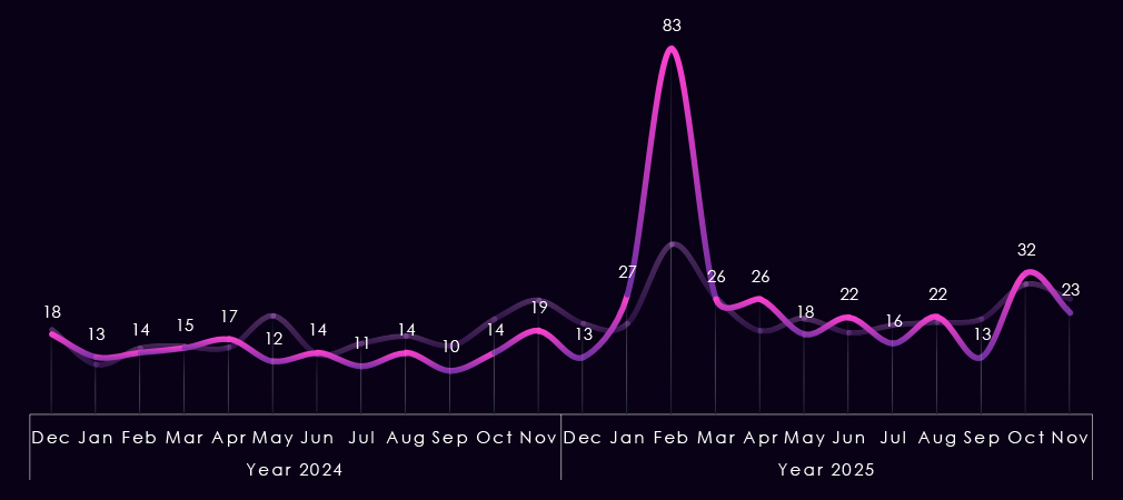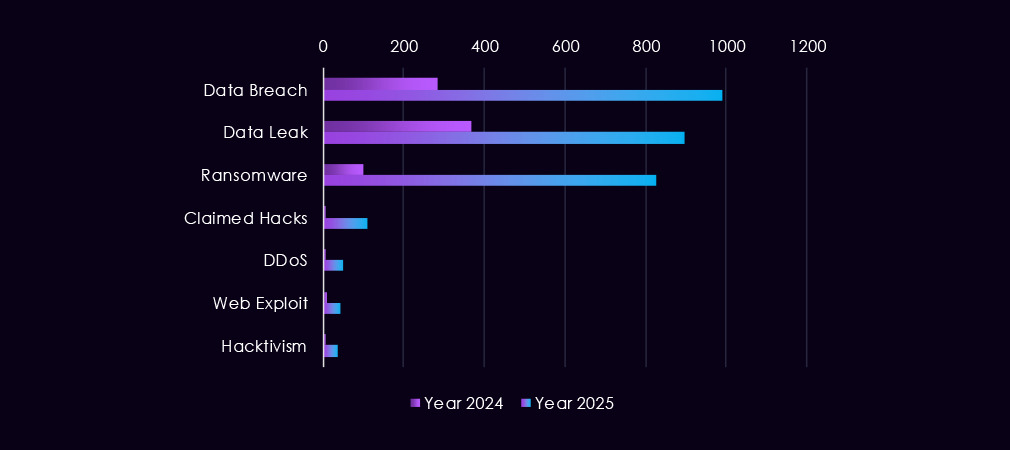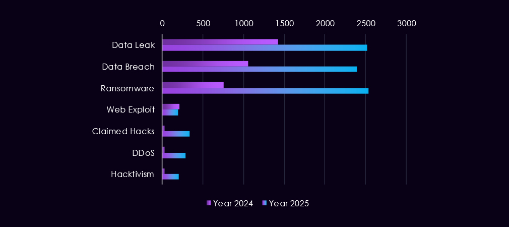 DDoS and hacktivism activity also becomes more visible in 2025, showing sharper and more frequent spikes than in 2024, though still secondary to data theft and ransomware narratives. Web exploit discussions remain present but uneven, appearing in short bursts linked to exploit discoveries.
