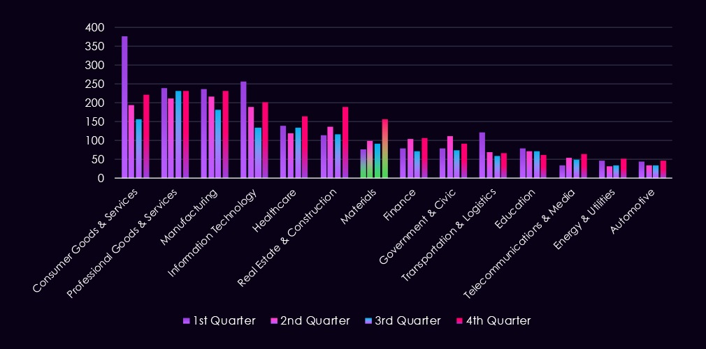 The bar chart above is focused only on 2025, and the victim counts per quarter are clear and easy to see trends. The materials industry recorded relatively even first three quarters of the year with a substantial spike in Q4, suggesting an elevation into 2026.