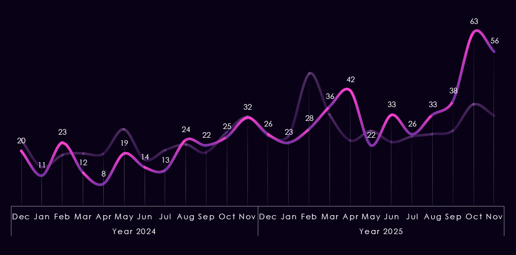 In 2025, though, we see major divergences in January and February, where Finance victims count went low compared to the global spike; however, in May and September, we saw large spikes of Finance victims where global activity was flat.