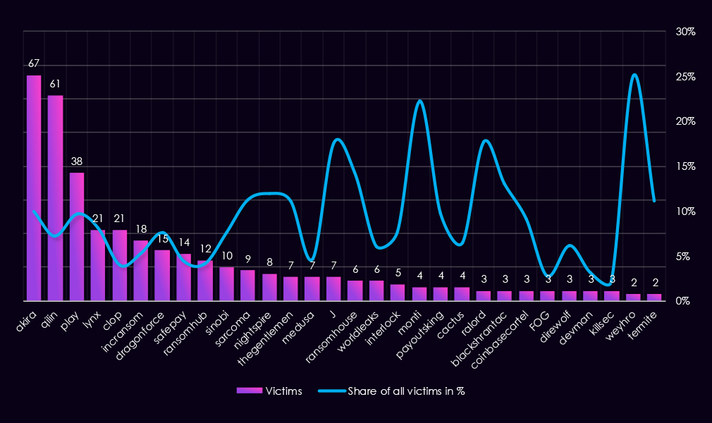Q3 activity stayed high but became more concentrated. Qilin (31) led the quarter, followed by Akira (20) and Play (13). A number of groups, including Sinobi (10) and WorldLeaks (10), appeared or increased activity, contributing to a broader mid-year threat landscape.