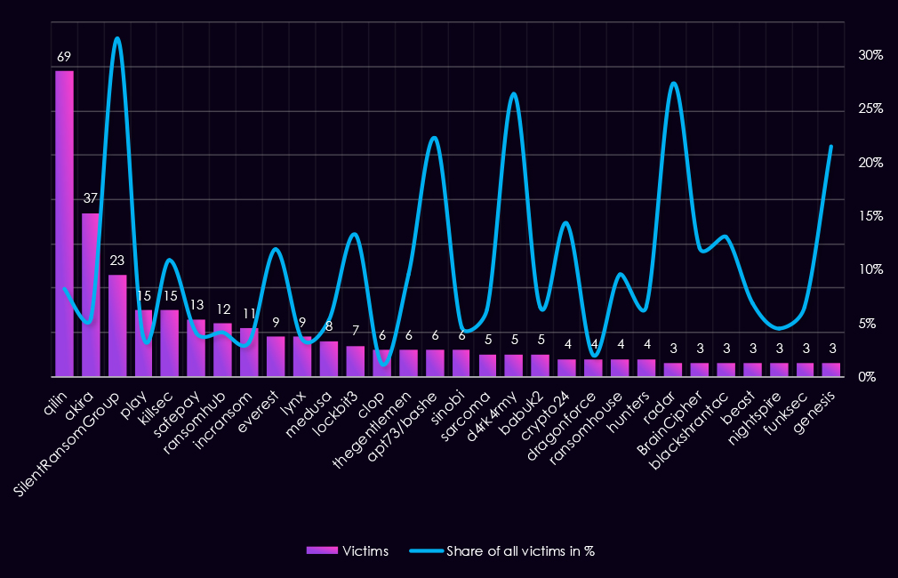 Q3 marked a change in momentum. Qilin became the most active group in the finance sector, significantly increasing its victim count compared to earlier quarters. Overall activity narrowed to fewer groups, but with higher volumes among leading actors.