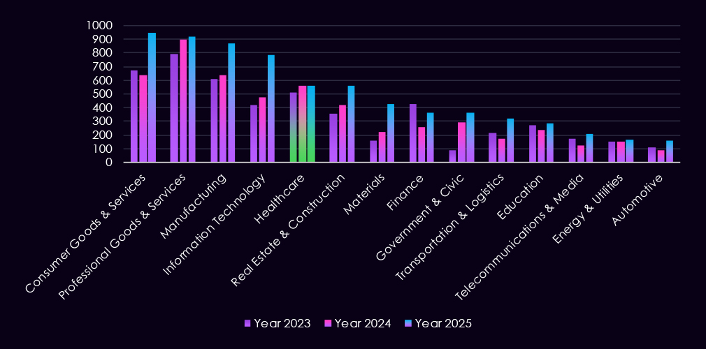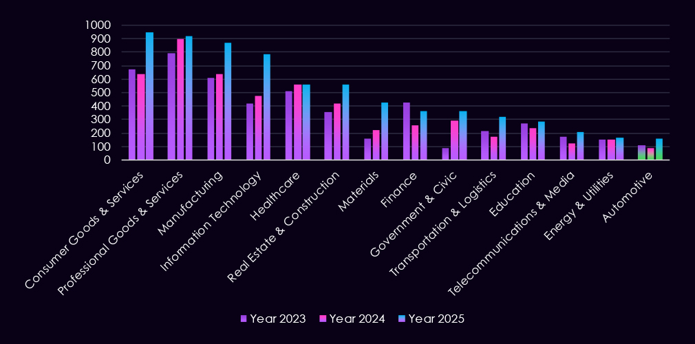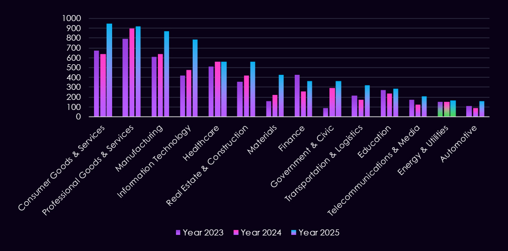 Sustained victimization is also observed across South and Southeast Asia, including Thailand, India, Vietnam, the Philippines, Indonesia, and Singapore, regional manufacturing hubs and supplier ecosystems. Additional activity across Europe and the Middle East – including Germany, France, Spain, Saudi Arabia, the United Arab Emirates, and Qatar – points to globally distributed targeting aligned with production capacity, energy inputs, and logistics connectivity, rather than focus on a narrow set of manufacturers.