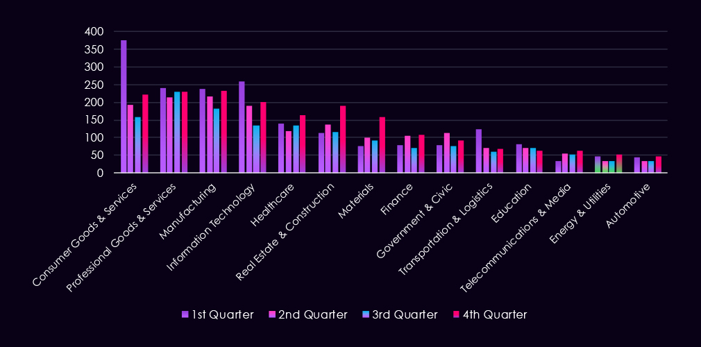 The bar chart above is focused only on 2025, and the victim counts per quarter are shown clearly and easily to see the trends. Energy & utilities have a higher victim count in Q1 and Q4, with a minor dip in between.