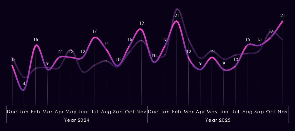 Q3 marked a further escalation and shift in leadership. Qilin (21) overtook other actors, followed by Akira (16) and Play (10). Several additional gangs, including DragonForce (8) and WorldLeaks (4), appeared or increased activity, contributing to a broader threat landscape.