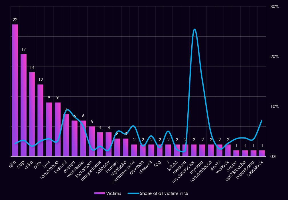 In Q2, activity increased and became more competitive. Akira (21) emerged as the most active gang, while Qilin (10), Lynx (11), and Play (9) also showed significant growth. The decline of Clop and RansomHub suggests early-year campaigns did not persist into the second quarter.