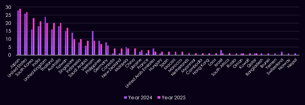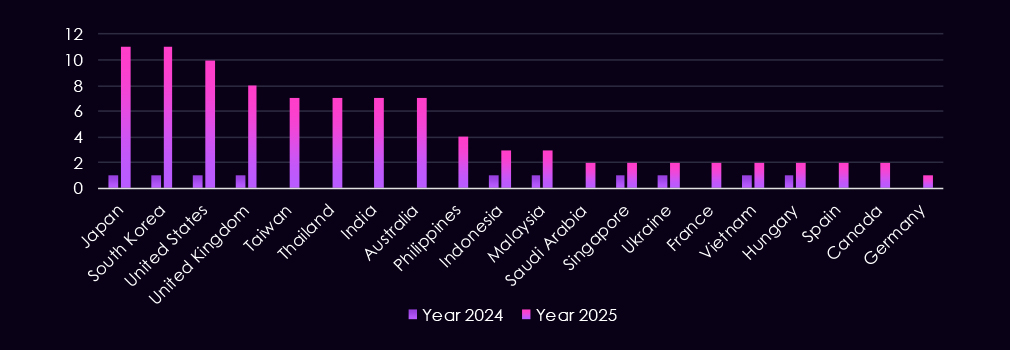 We observed geographic concentration of victims in the Asia-Pacific and Western economies, which remain primary targets. In 2025, Japan, the United States, the United Kingdom, Australia, India, South Korea, Thailand, and Taiwan continue to dominate, reflecting their role as major regional financial hubs and strategic targets. Compared to 2024, 2025 shows a broader regional spread, with increased activity across Southeast Asia and a steady expansion into the Middle East (e.g., Saudi Arabia, UAE) and Europe (Germany, France), indicating both opportunistic cybercrime and sustained nation-state interest in the globally connected finance industry.
