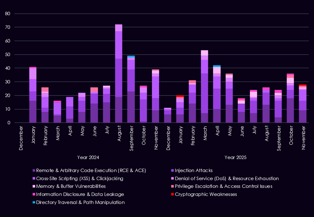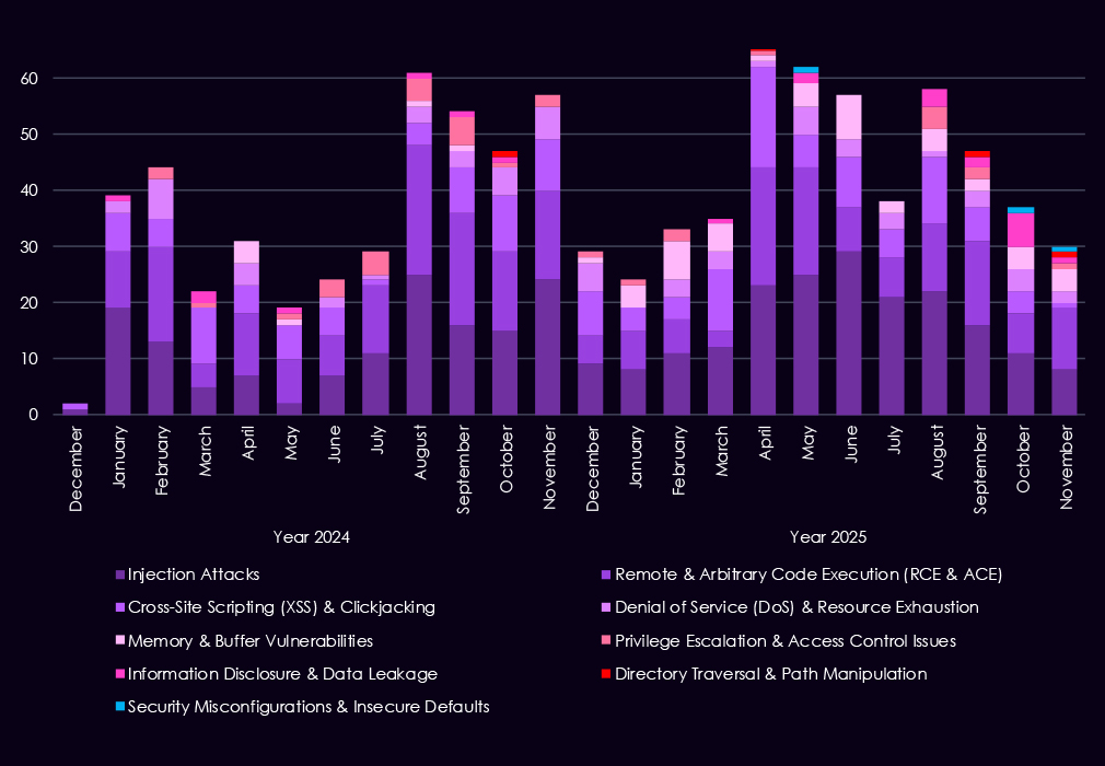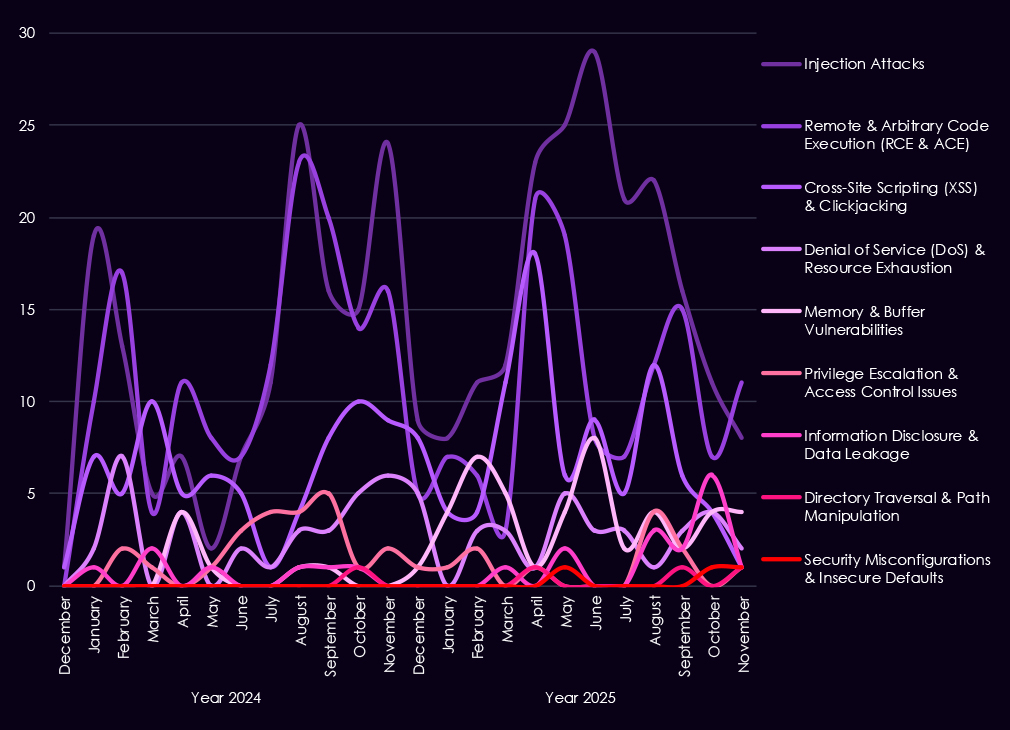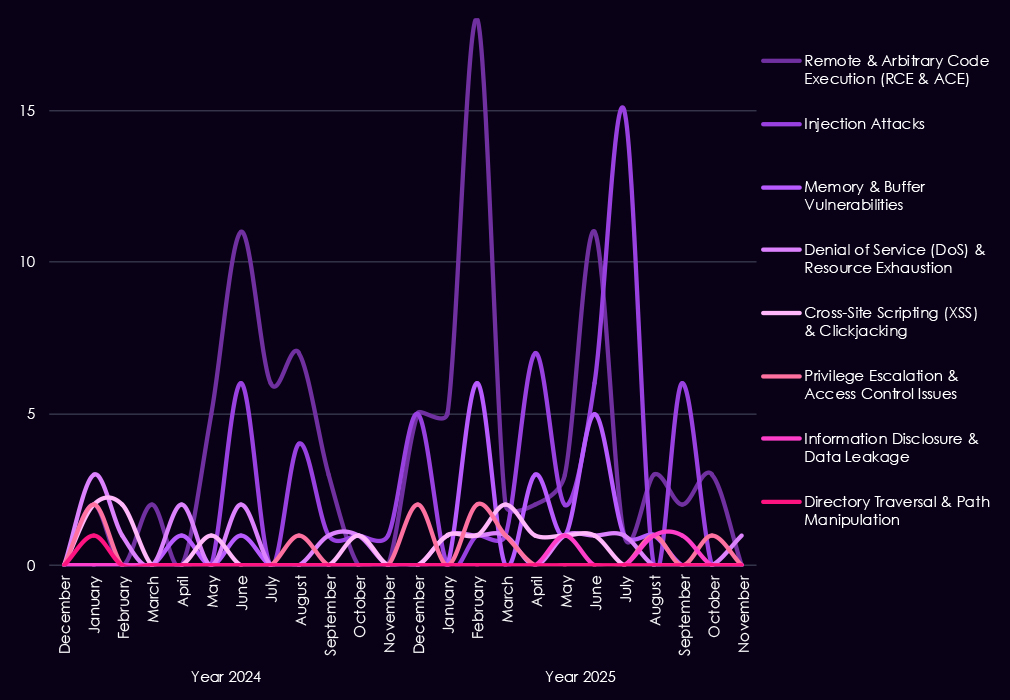 Injection flaws continue to appear in spikes, especially in early to mid-2025, showing that web-facing financial applications remain exposed despite long-standing awareness of these risks. In contrast, XSS and clickjacking decline in importance, suggesting attackers are placing less value on lower-impact client-side issues. While less frequent, memory corruption, privilege escalation, and access control weaknesses show up more regularly in 2025, indicating a growing focus on post-compromise activity and vulnerability chaining.