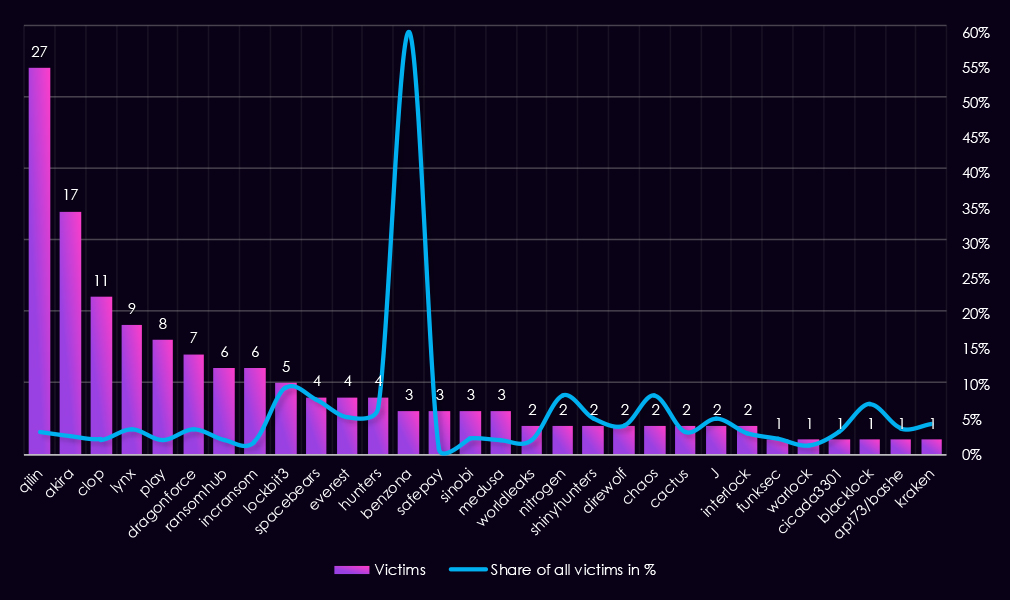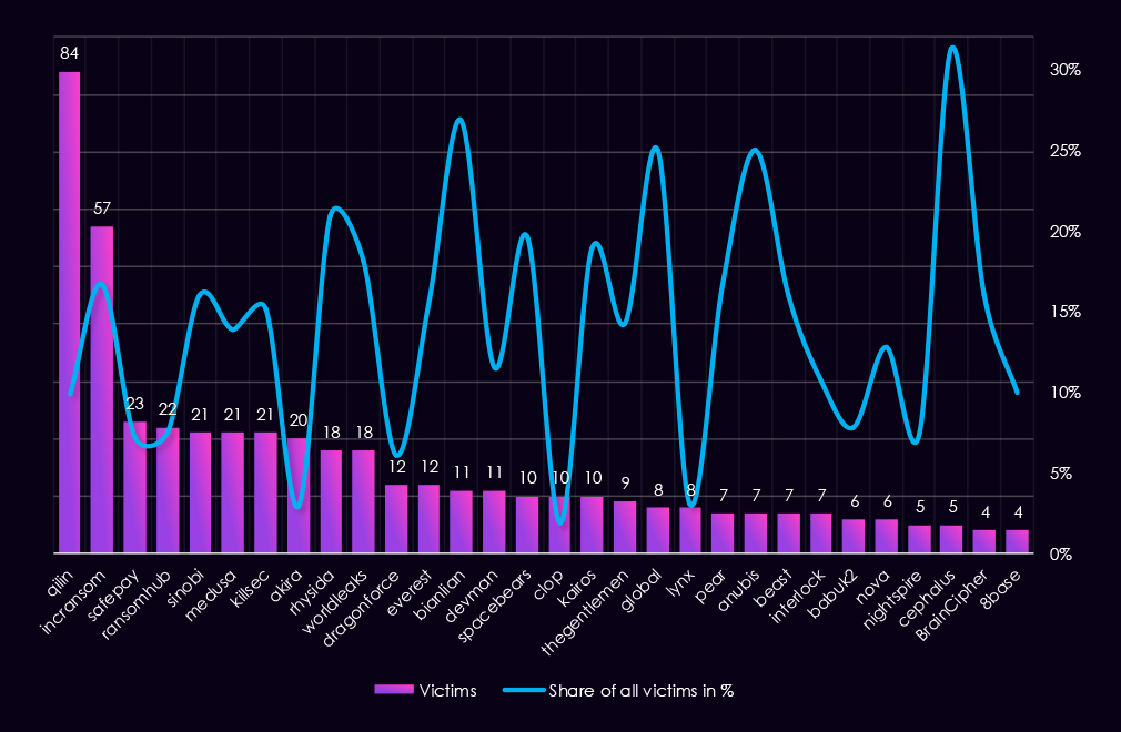Qilin recorded the highest number of finance victims (69), but finance represents only 8.2% of its total victims, indicating scale rather than focused targeting. Akira shows a similar pattern, with 37 victims and a 5.5% share, consistent with broad, multi-sector targeting.