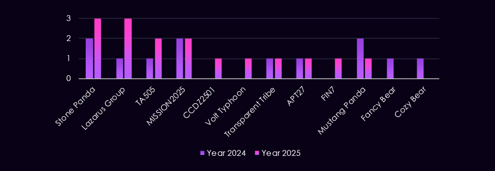 In 2025, China-aligned actors such as Volt Typhoon, Salt Typhoon, Stone Panda, and MISSION2025 featured prominently, indicating sustained interest in materials production, extraction technologies, and upstream supply chains. Lazarus Group also appears, reflecting continued dual-use targeting tied to both strategic and financial objectives.