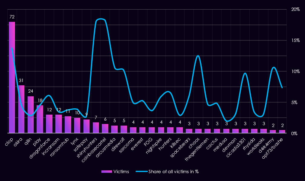 Some high percentage values are driven by low overall victim counts. Radar (27.3%), Genesis (21.4%), Crypto24 (14.3%), and BlackShrantac (13.0%) each recorded only three to four finance victims, making these shares statistically skewed and less indicative of sustained targeting.