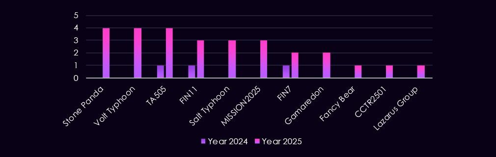 At the same time, financially motivated groups such as FIN7, TA505, and FIN11 remain consistently active. Lazarus Group continues to operate at the intersection of state and financial motives, using attacks on financial entities to support state funding. The appearance of multiple newly tracked CC- and NS-prefixed groups in 2025 further reflects a broader and more geographically diverse threat landscape.