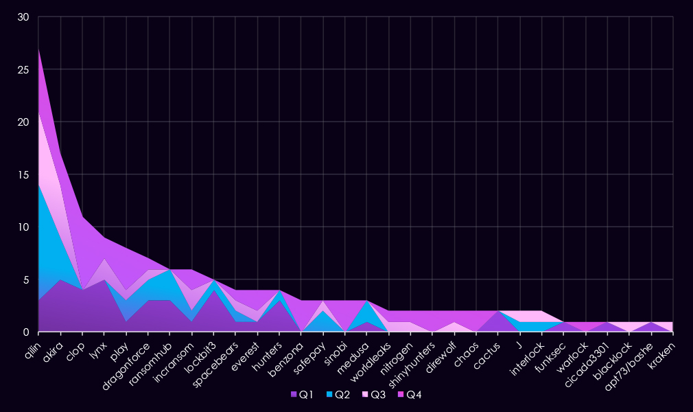 By Q4, activity remained elevated but dispersed. Qilin (10) continued to lead, while Clop (6), Akira (4), and Play (4) showed renewed or sustained engagement. A long tail of low-volume gangs appeared with one to two victims each, suggesting opportunistic targeting rather than concentrated campaigns.