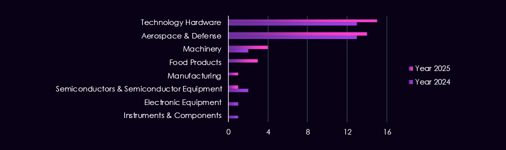 In total, 88 out of 124 gangs recorded victims in the manufacturing industry during 2025, representing 71% participation.