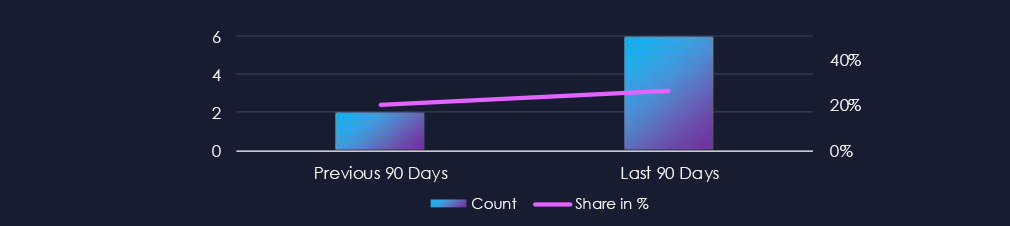 90 → 89 → 134, Noticeable jump in the latest period after stable early activity. Indicates renewed targeting of automotive companies, likely focused on corporate networks, design data, or connected vehicle platforms. The increase also reflects recent high profile incidents.