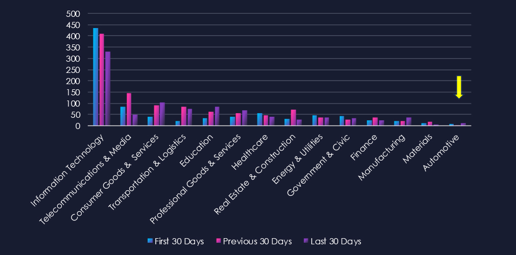 Automotive industry placed 14th out of 14 monitored industries recording 36 victims in last 90 days. Only marginal increase of 2.9% from 35 victims in previous 90 days period.