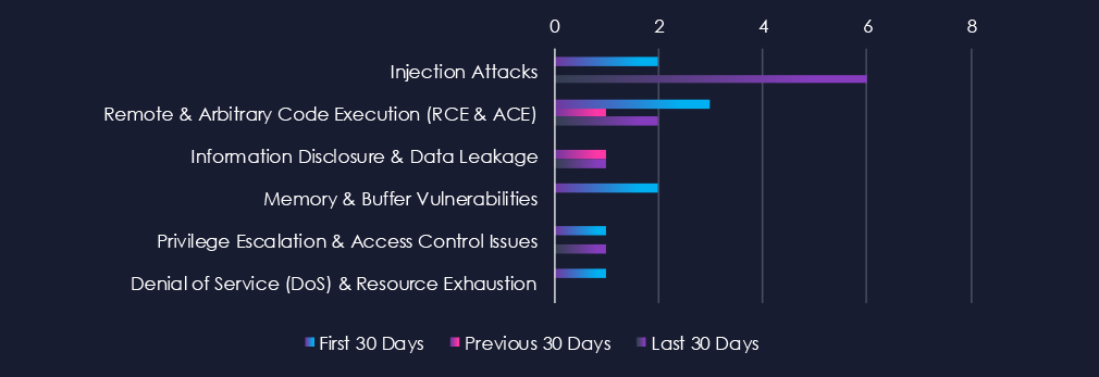 Injection attacks are leading the chart, however there were none during previous 30 days. Remote & Arbitrary Code Execution (RCE & ACE) and Information Disclosure & Data Leakage follow. Remaining categories are minimal, but even single vulnerability can be critical.