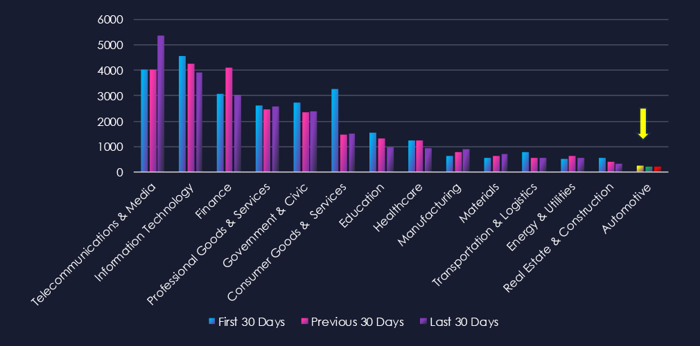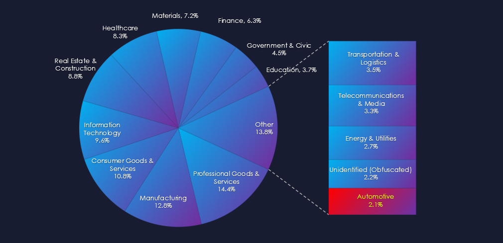 In total, automotive industry comprise 0.90% of all detected industry underground and dark web chatter in the last 90 days. And ranking 14th out of 14 industries.