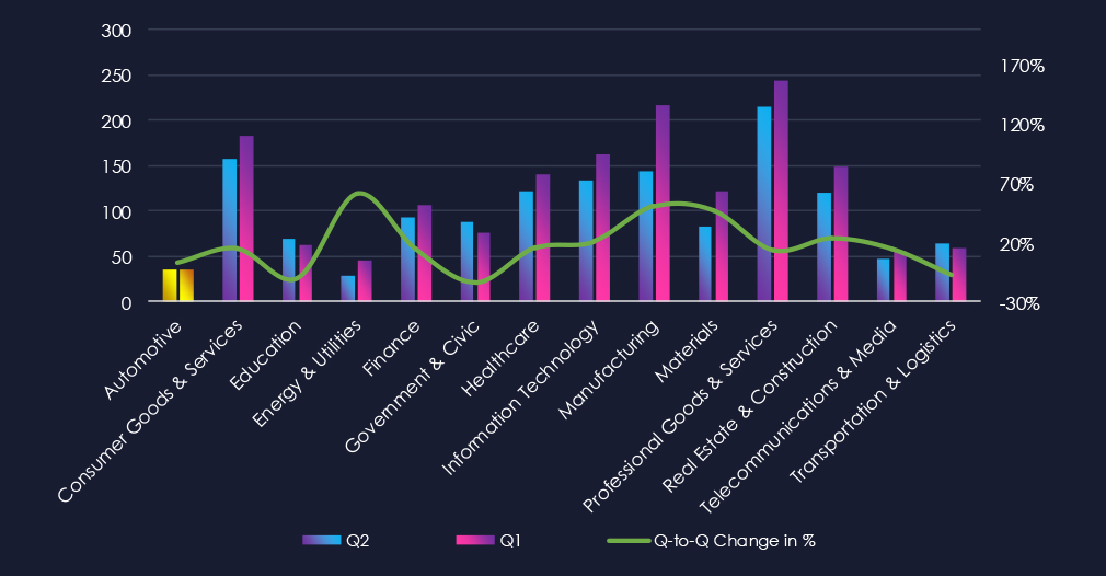 Furthermore, a quarterly comparison reveals sustained levels of interest in automotive organizations with only minor change of +2.9% from 35 to 36 victims. The overall share however mildly declined from 2.43% to 2.13% of all victims.