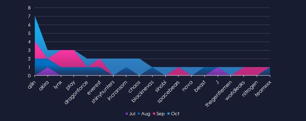 A breakdown of monthly activity per gang reveals which gangs were active each month. For instance, the most active gangs, Qilin and Akira, were highly active throughout the months. However, Qilin did not have any victims in July, while Akira did not record any in September. On the other hand, gangs like ShinyHnters or Chaos were only active during October.