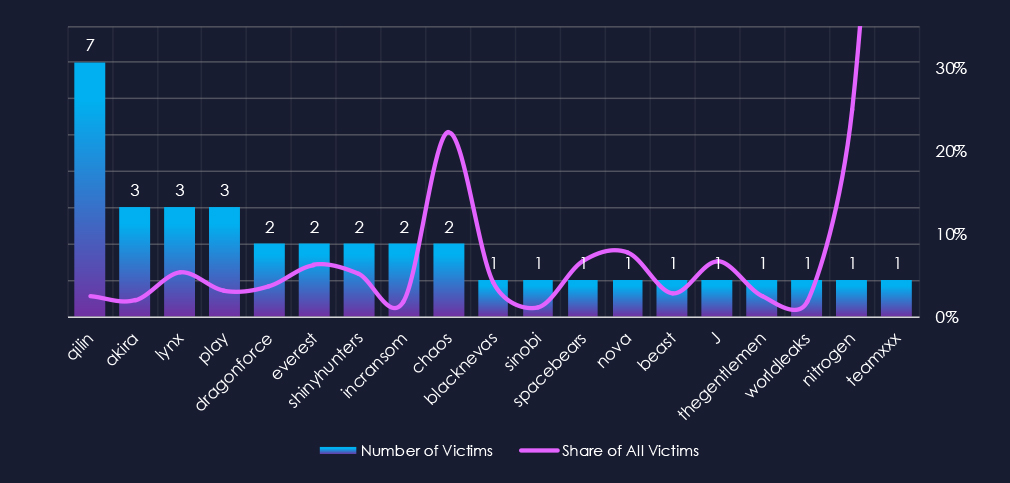 Among the top gangs, Lynx (5.4%), Everest (6.3%), and ShinyHunters (5.1%) had the highest share of victims; the rest is deep below the 5% mark. TeamXXX recorded 100% share but with only 1 out of 1 victims, hence skewing the scale.