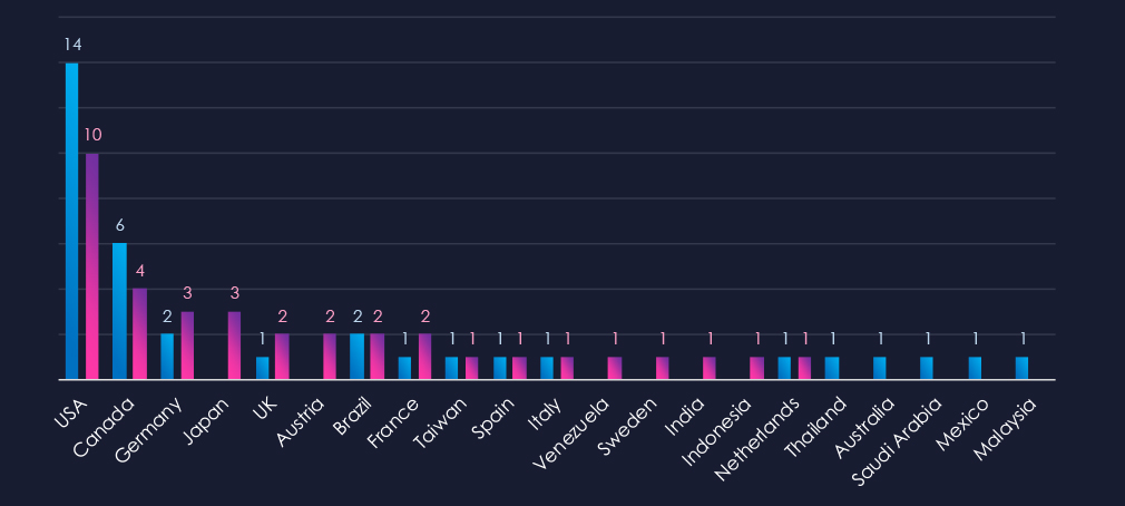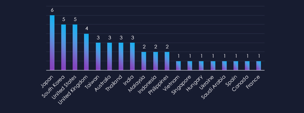 Campaigns focused on known automotive nations. Japan, South Korea and the US were top 3 attacked countries.
