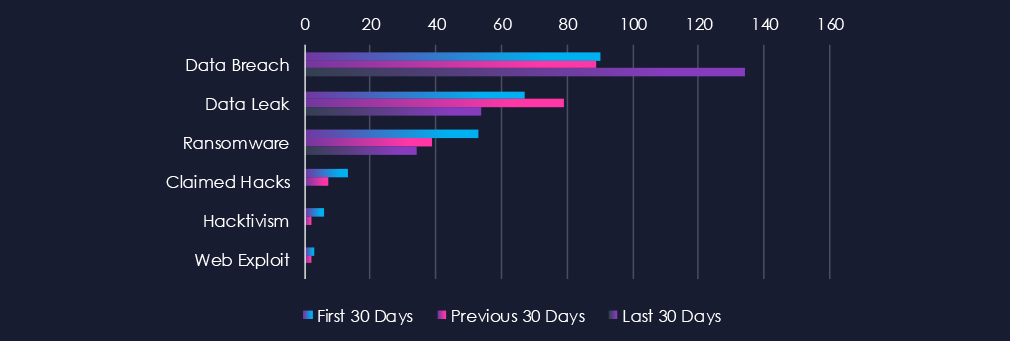 Underground & Dark Web Chatter (Low): The automotive sector generated minimal underground chatter (0.9% share, 14th of 14 industries). Data breaches rose sharply in the latest period (134 from 90), reflecting renewed targeting of automotive manufacturers and suppliers, likely linked to high-profile incidents involving design or connected vehicle data. Data leaks declined, while ransomware and hacktivism fell steadily, suggesting lower public exposure but continued background risk. Claimed hacks dropped to zero, consistent with attackers favoring private access sales. Web exploit chatter also disappeared, possibly due to improved perimeter defenses and hardened OEM networks.