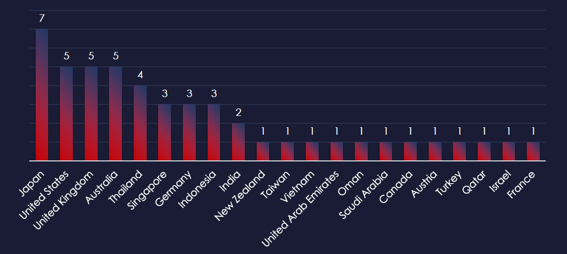 30% of all victims are located in the US. Followed by Israel (4 victims) which is being targeted by a dedicated group in retaliation for the ongoing conflict