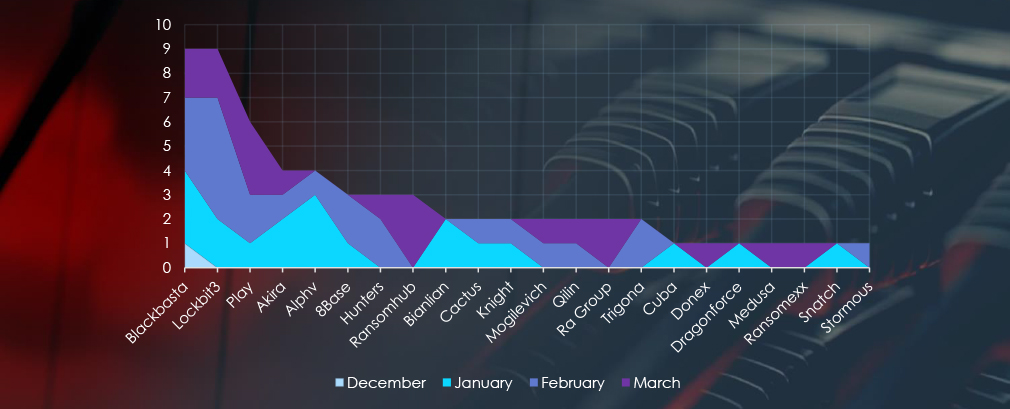 A breakdown of monthly activity offers insights into the activity of individual gangs. For instance, ALPHV recorded the highest number of victims in January, while Ransomhub recorded all their victims in this industry in March.