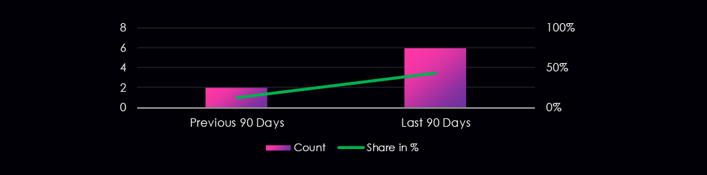 During the last 90 days, most of the activity occurred during January. Preceding November saw no campaigns, December only one, and in just a few days of February, we already see a new campaign, suggesting an uptick will be ongoing into next quarter.