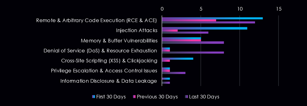 Reported energy & utilities-related CVEs are dominated by remote and arbitrary code execution and injection vulnerabilities across all three 30-day periods. Memory and buffer-related issues remain consistently present, while denial-of-service and resource exhaustion vulnerabilities increase sharply in the most recent period. Other vulnerability classes appear intermittently at low volumes, reflecting variable disclosure patterns rather than sustained shifts in attacker focus.