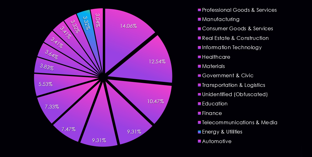 Obscura (27%), Direwolf (12%), and previously mentioned 0apt (9%) showed the highest focus on this industry from groups with a meaningful number of victims.