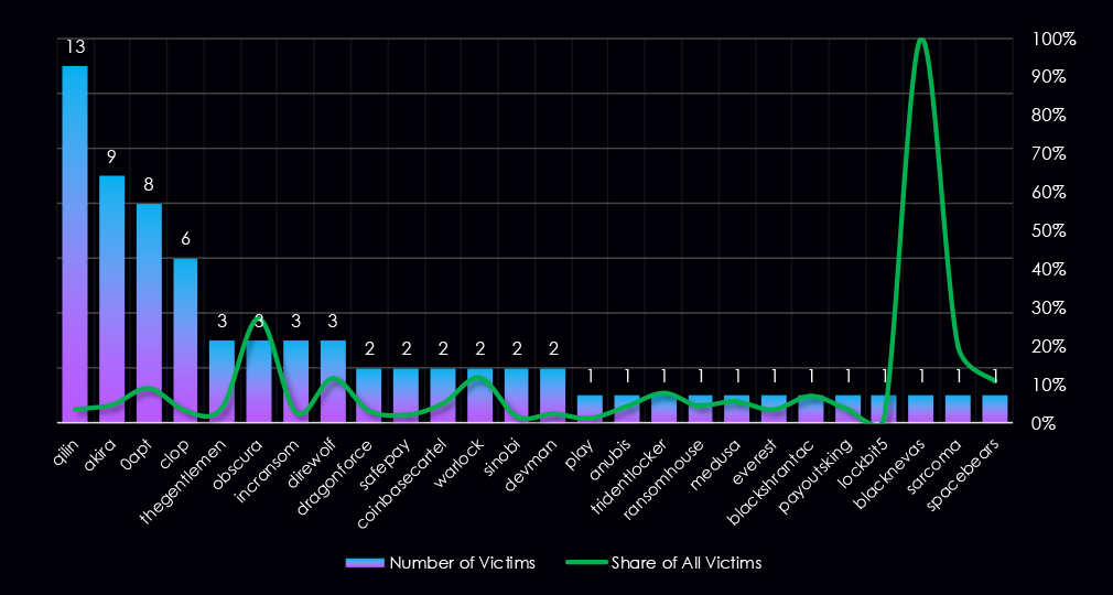 Qilin and Akira had the highest number of victims, however, low shares of 3.4% and 4.8% of all their victims. That means their numbers are opportunistic targeting and the large scale of their activity.