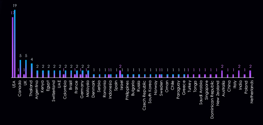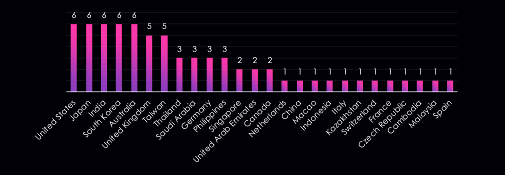 Victims were identified across a wide geographic range, with the highest concentrations observed in the United States, Japan, India, South Korea, and Australia, each accounting for six detected victims. Additional activity is observed across Europe, the Middle East, and Southeast Asia, indicating broad geographic exposure rather than regionally isolated targeting.