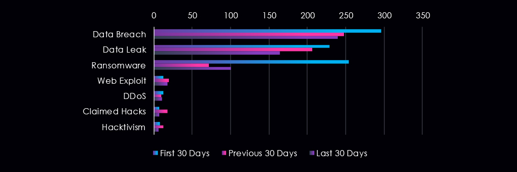 Data Breaches and Data Leaks have been the most talked-about topics in this industry. Both categories have seen a slowdown in discussions over the entire 90-day period. Ransomware after strong first 30 days, declined to less than a third of volume, and then rebounded slightly over the last 30 days. Other categories were only minor, but all except DDoS recorded small upticks in the previous 30 days.