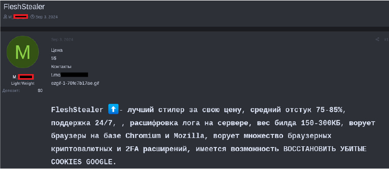 The developer of Flesh Stealer is a Russian speaker and employs the common tactic of avoiding attacks on CIS countries, a strategy often used by Russian or CIS-based developers to avoid being banned from Russian-based forums. The developer is active on two or three forums, including PyrexGuru, Dzen.