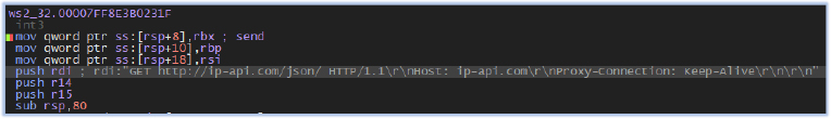 After initialization, the WinHttpOpen function is called to initialize a WinHTTP session, and then the Winsock API send() is used to check the IP address information of the host machine: