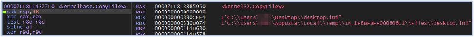 The specimen creates a directory under the user’s Temp directory (C:\Users\user\AppData\Local\Temp). The directory name is based on the country code retrieved from the IP address details and the system time, which is obtained using the GetSystemTimeAsFileTime function: